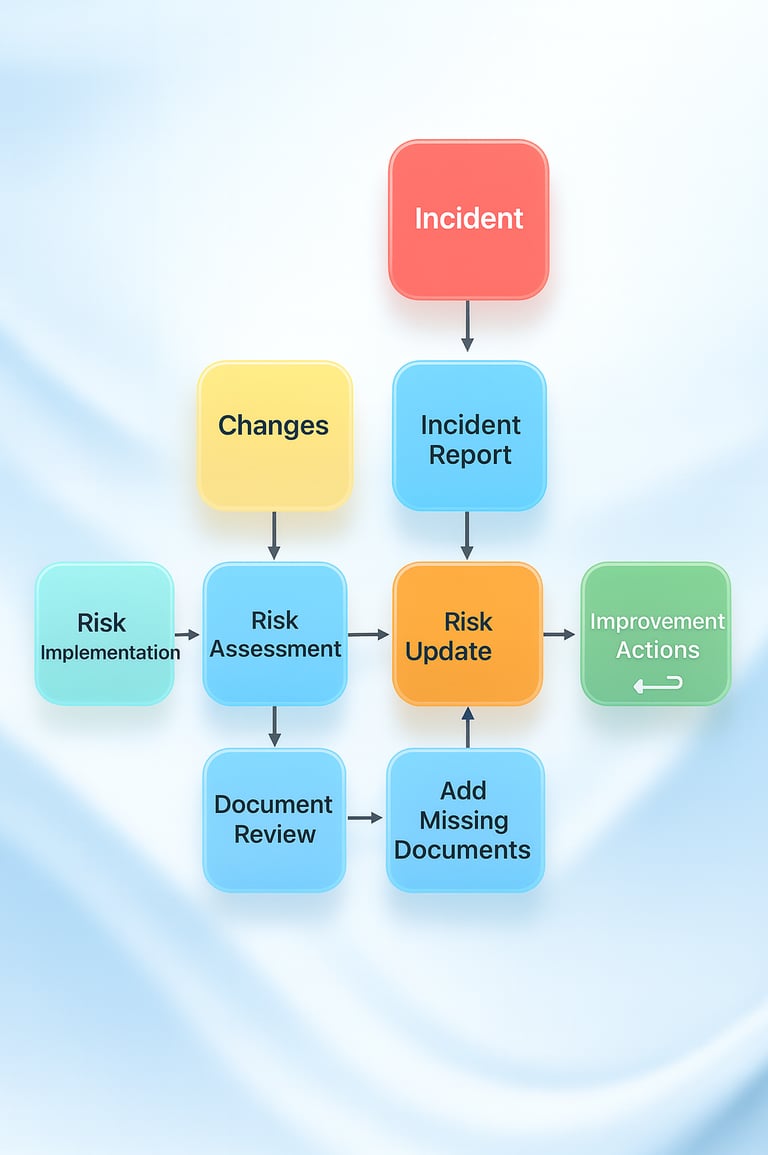 Every action focuses on what truly matters: incident → report → risk update → corrective actions.